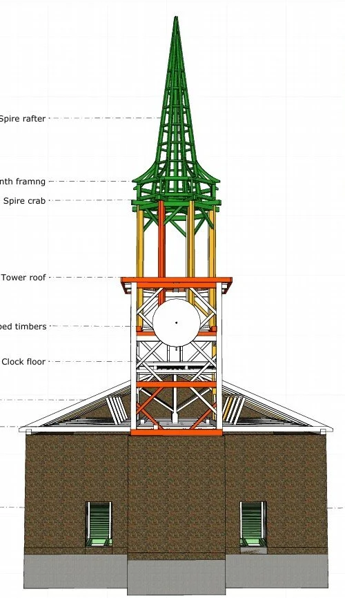 Here is the architectural drawing of the restoration work with the “new” replicated 30’ spire. All new balustrades, urns and weathervane will replicate the original.